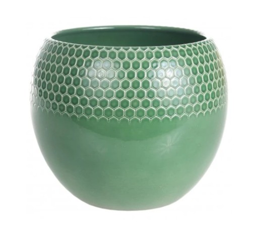 Osłonka Heksagon w kształcie kuli to wyjątkowa osłonka dla domowych roślin ozdobnych. Od spodu osłonka ma gładką powierzchnię, natomiast nieco powyżej połowy jej wysokości zaczyna się heksagonalny wzór, który ciągnie się po sam górny brzeg naczynia. Szkliwienie pokrywa zarówno wierzchnią jak i wewnętrzną ściankę osłonki.
