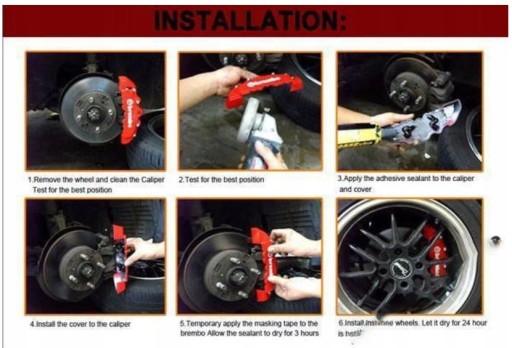 Najczęściej montaż odbywa się za pomocą kleju do wysokich temperatur lub na wkręty do zacisku, nakładki są uniwersalne i pasują na większość zacisków dlatego w niektórych przypadkach może być też wymagane podcięcie wewnętrznych rogów lub wewnętrznych części nakładki, więcej można zobaczyć na filmach w poniższym linku YT