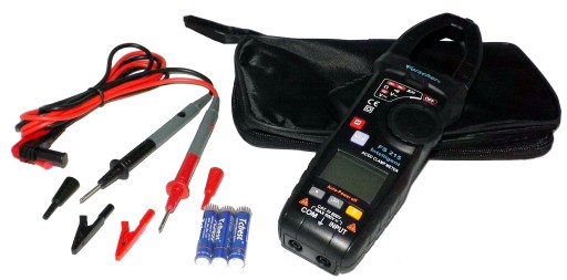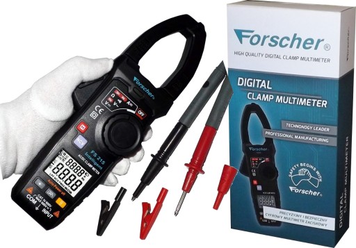 w zestawie : miernik cęgowy Forscher FS215 ,etui , silikonowe przewody pomiarowe (komplet) ,krokodylki (komplet) adaptory banan 4mm (komplet) baterie R3 3 szt.
