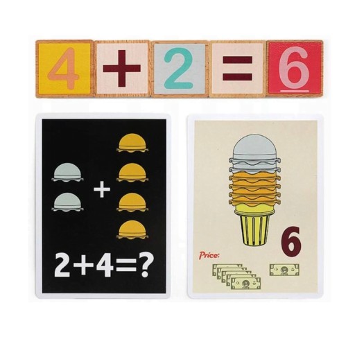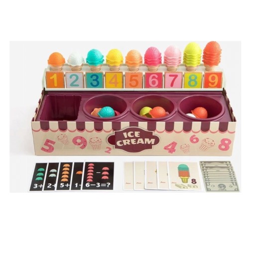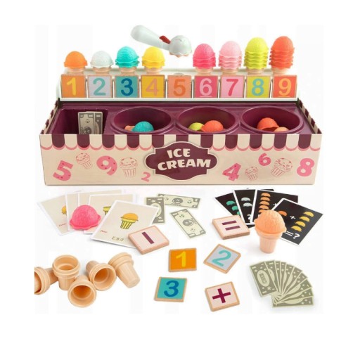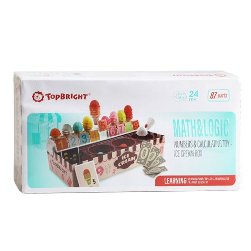 Drewniana zabawka edukacyjna nauka liczenia Lodziarnia firmy Top Bright. Zestaw składa się z 87 elementów: dwu-elementowej podstawki – dyspozytora na stworzone lody oraz dyspozytora dodatków z miejscem na banknoty, rożków do lodów, drewnianych klocków z liczbami, łyżki do lodów i innych elementów. Zabawka wspiera rozwój koordynacji wzrokowo-ruchowej oraz wspiera podstawową naukę liczenia, poznawania cyfr oraz kolorów i różnych faktur.Zabawka ta należy do grupy zabawek stosujących metodę MONTESSORI.