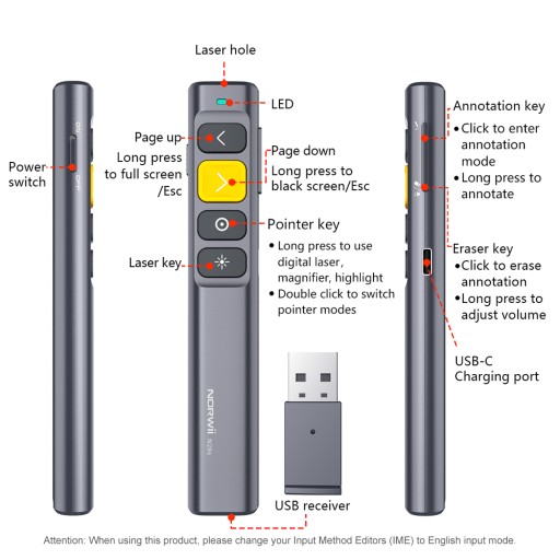 Pilot Norwii N28s to nie tylko kontrola slajdów. Wbudowany wskaźnik laserowy umożliwia precyzyjne podkreślanie istotnych elementów na ekranie. Bez względu na to, czy prowadzisz wykład motywacyjny, lekcję lub sesję szkoleniową, to narzędzie z pewnością ułatwi Ci pracę. Wykorzystaj go, aby zaznaczyć kluczowe punkty prezentacji z odległości nawet 200 metrów.