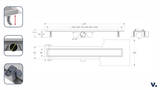 Линейный трап VOGI RIGO, решетка STRIPES - 50 см