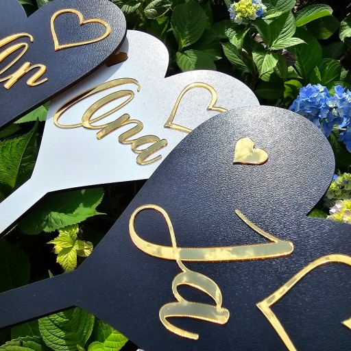 Prezentujemy zestaw tabliczek oczepinowych, idealny dodatek do Twojej zabawy weselnej! Nasz zestaw składa się z czterech sztuk tabliczek oczepinowych z napisami wykonanymi ze złotej lustrzanej plexi, które dodają im elegancji i blasku. Każda tabliczka ma kształt uroczego serca, które dodaje romantycznego nastroju.