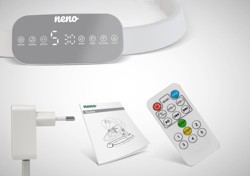 Neno Nube otrzymujesz w zestawie, który zawiera wszystko, czego potrzebujesz, aby wygodnie korzystać z produktu: bujak, pilot umożliwiający zdalne sterowanie, zasilacz i dokładną instrukcję użytkowania.