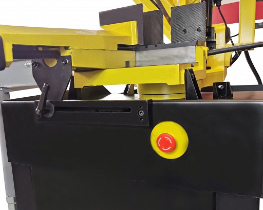 Przecinarka taśmowa do metalu (posiadająca CE) umożliwia zarówno cięcie prostopadłe, jak i cięcie pod dowolnym katem, którego zakres obejmuje od -45 do +60 stopni. Cięty element może być podawany manualnie lub automatycznie poprzez dowolne urządzenie podające. Posuw podczas cięcia odbywa się za pomocą siłownika hydraulicznego.