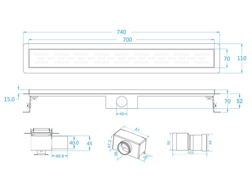 ЛИНЕЙНЫЙ СЛИВ ПОД ПЛИТКУ 70см НИЗКАЯ 52 мм
