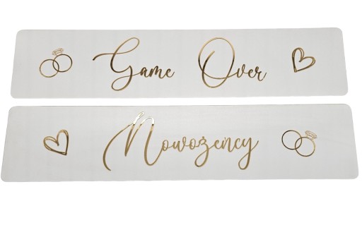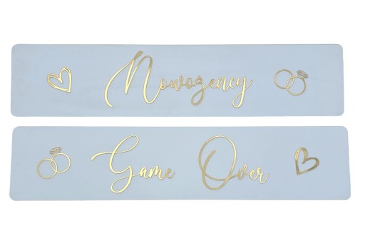Na pierwszej tablicy widnieje napis "Nowożeńcy", który pięknie podkreśla Wasz nowożeńczy status i jest idealnym sposobem na zwrócenie uwagi gości oraz przechodniów. Druga tablica ma napis "game over", który w humorystyczny sposób ukazuje, że teraz Wasza przygoda się zaczyna.