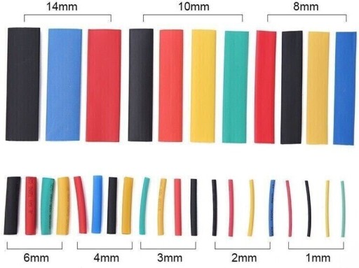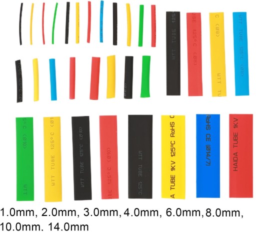 Co do średnic, zestaw zawiera rurki o różnych rozmiarach, obejmujących zakres od 1 mm do 14 mm. Ta różnorodność średnic pozwala na dopasowanie rurki do różnych grubości przewodów, zapewniając dokładne i trwałe zabezpieczenie.