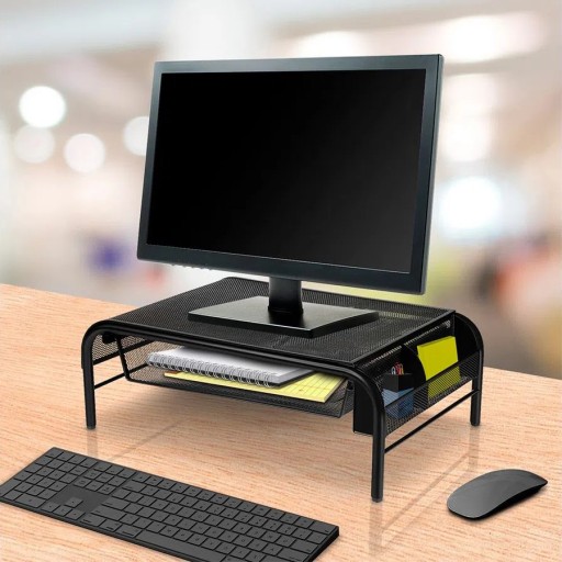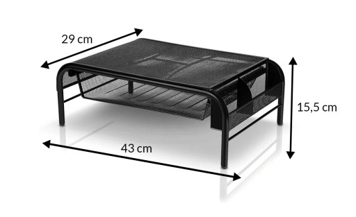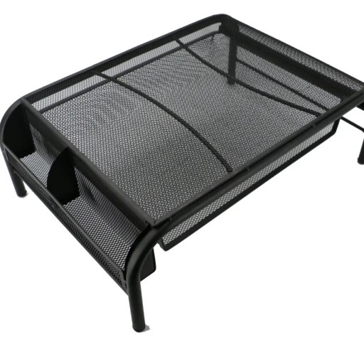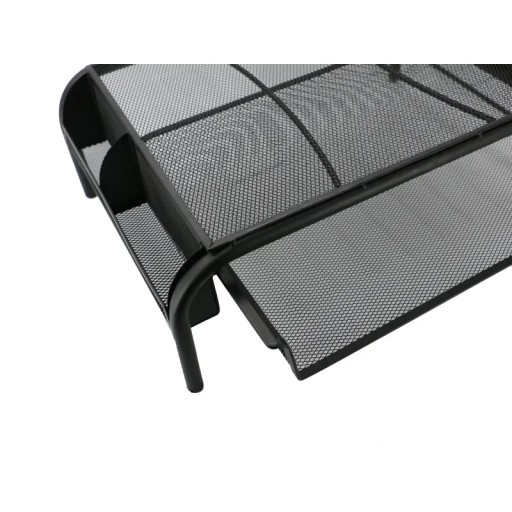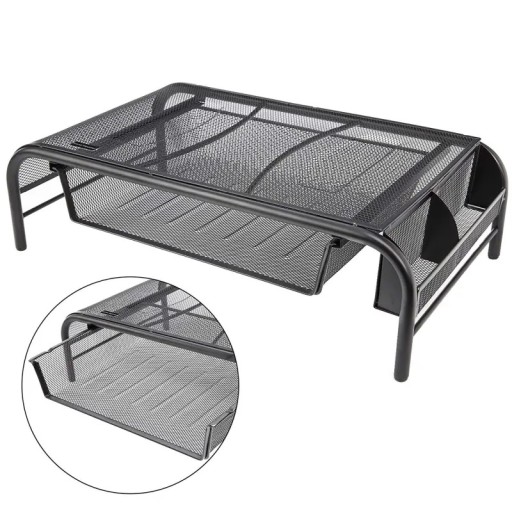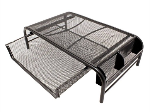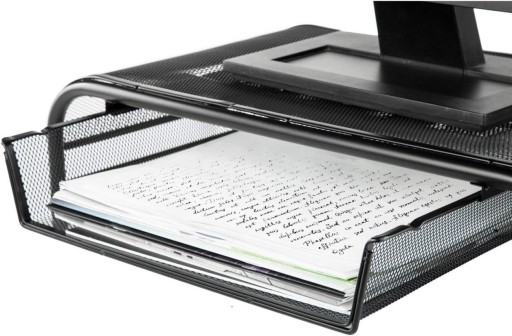 Dobra podstawka podnosząca ekran, szuflada na dokumenty i przegródka na długopisy - wszystko z wytrzymałej, stalowej siatki, która umożliwia cyrkulację powietrza i utrzymuje chłodną temperaturę urządzeń elektronicznych.