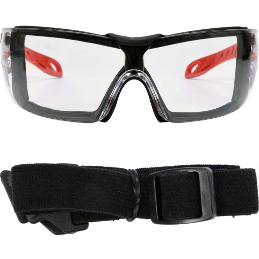 Nowoczesne okulary ochronne spełniające wymagania wielu grup użytkowników. Panoramiczne szyby wykonane z bezbarwnego PC poliwęglanu. Ramka posiada uszczelnienie wewnętrzne z tworzywa EVA. Funkcjonalny, regulowany, elastyczny pasek podtrzymujący, dopinany w specjalnych mocowaniach, rozszerza zakres zastosowań okularów np. dla sportowców. Okulary wykonane zgodnie z najnowszymi trendami branżowego wzornictwa.