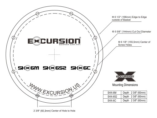 Samochodowe 2-drożne głośniki współosiowe z mid-wooferami o średnicy 165 mm marki Excursion z serii SHX (Street High Power eXcursion). Głośniki z serii SHX, to bardziej zaawansowane brzmieniowo produkty o podwyższonej wydajności przeznaczone do uniwersalnych zastosowań oraz jako zamienniki fabrycznych głośników (OEM). W porównaniu do cieszących się bardzo dobrą opinią głośników z niższej serii SX, głośniki współosiowe SHX prezentują znacznie dojrzalszy i bardziej dynamiczny charakter brzmienia. Wyższa moc wzmacniacza przeważnie zawsze zapewnia lepszą kontrolą głośników. Z tego powodu impedancja cewek mid-wooferów SHX została obniżona do 3 Ohm. Jest to jeszcze akceptowalna wartość przez większość standardowych radioodtwarzaczy i dobre systemy fabryczne. Dzięki temu można efektywniej wykorzystać każdy wzmacniacz, nawet wbudowany w radioodtwarzaczu, uzyskując z niego dodatkowo ok. 25% więcej mocy, co w praktyce przekłada się na bardziej dynamiczne brzmienie. Stożkowe membrany mid-wooferów wykonano z bardzo dobrego materiału, którym jest kompozyt papieru i naturalnej wełny wzmocniony domieszką włókna szklanego. Sprawia to, że membrany są lżejsze ok. 10%, co skutkuje wyższą detalicznością brzmienia w zakresie średnich tonów oraz odczuwalną poprawą szybkości ataku fundamentu basowego (po wstępnym okresie docierania). Natomiast większy o 25% układ magnetyczny EFF (Efficient Flux Field) i wydłużona szczelina cewki umożliwiają większe liniowe wychylenia membrany, zapewniając wyższą wydajność głównie w zakresie niskich tonów. Stalowe kosze oraz aluminiowe karkasy cewek zostały wyposażone w dodatkowe otwory wspomagające system chłodzenia. Z kolei membrany głośników wysokotonowych to bardzo dobrej jakości 20-milimetrowe kopułki z naturalnego jedwabiu. Dzięki temu najwyższy zakres pasma akustycznego zawsze brzmi naturalnie oraz obfituje w dużą ilość detali i akustycznych szczegółów.