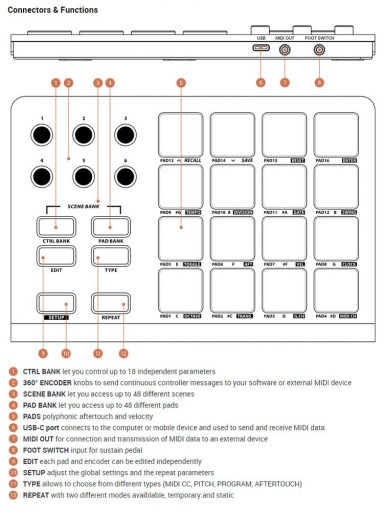 Pady kontrolera doskonale nadają się do obsługi wirtualnych instrumentów na scenie. Dodatkowo oferują funkcję Aftertouch, która wprowadza zupełnie inny poziom ekspresji i kontroli.