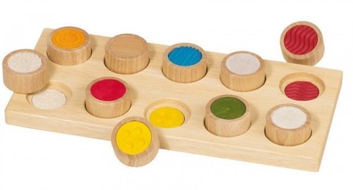 Memo dotykowe to wspaniała i szalenie wciągająca układanka. Składa się z planszy do gry, która wyglądem przypomina farbki oraz 10 otworów wypełnionych innym kolorem i teksturą. Do zestawu dołączone są również drewniane korki, które także zostały wypełnione tymi materiałami. Zadaniem dziecka jest takie ich dopasowanie, aby strukturą odpowiadały poszczególnym otworom. Gra jest angażująca, ponieważ o ile młodsze dzieci mogą używać memo do przyporządkowywania walców pod względem pasującego koloru, tak starsze mogą urozmaicić ją o zgadywankę z innymi dziećmi oraz zakrycie oczu!