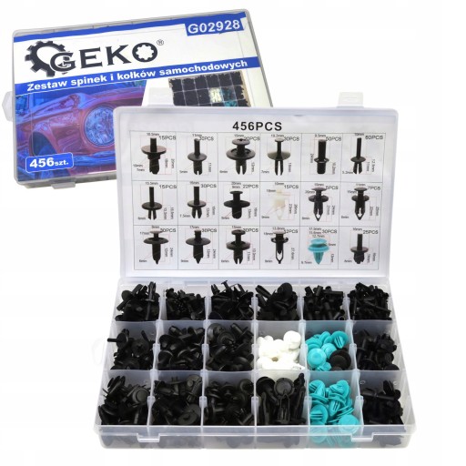 Duży zestaw spinek, kołków rozporowych oraz montażowych stosowanych we wszystkich najpopularniejszych markach samochodów. Zestaw składa się z 456el.