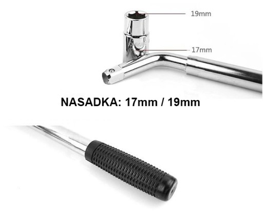 Prezentowany klucz posiada na swoich końcach typowe nasadki do śrub występujących w kołach samochodów dostawczych i osobowych czyli 17mm, 19mm.