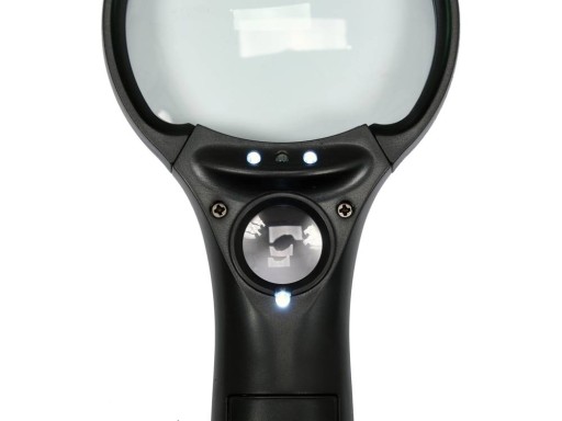 Dwa szkła powiększające. Większe - szklane, o średnicy 75 mm powiększa x3. Mniejsze - z akrylu, o średnicy 20 mm powiększa aż x45. Podświetlenie z trzech diod LED lub pojedynczej diody UV ułatwia inspekcję połączeń lutowniczych, odczytanie napisów z układów SMD, czy chociażby czytanie w ciemności.