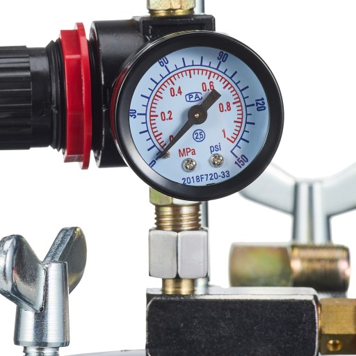 Regulowane pokrętło ciśnienia umożliwia ustawienie ciśnienia w zakresie od 0 do 60 psi. Zawór bezpieczeństwa automatycznie uwalnia ciśnienie, gdy ciśnienie powietrza przekroczy 0,5 MPa.