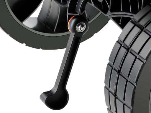 Dzięki 25-centymetrowym oponom z pełnej gumy nie musisz sprawdzać napompowania ani ciśnienia powietrza. Duże koła lepiej amortyzują wstrząsy i pokonują przeszkody, dzięki czemu wózek nadaje się na łąki, piaszczyste plaże i szutrowe drogi.