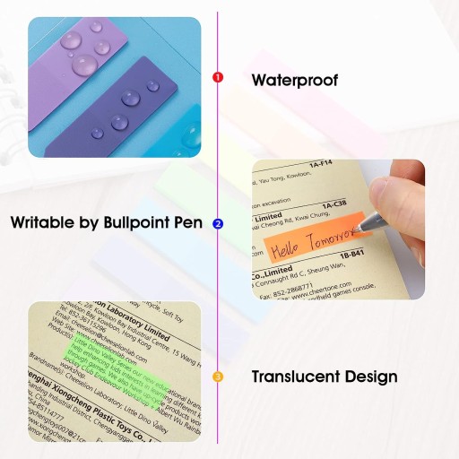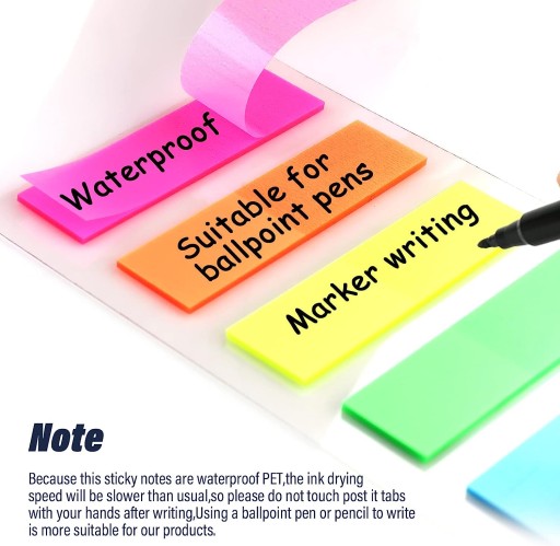 [Unikalny design] Przezroczysta konstrukcja zakładek samoprzylepnych pozwala zakładkom indeksowym podkreślać ważny tekst bez zakrywania wiadomości. Zakładki do notatek są wodoodporne, atrament wyschnie wolniej niż zwykle, więc nie dotykaj ich rękami po pisaniu; pisanie długopisem lub ołówkiem jest bardziej odpowiednie dla naszych zakładek