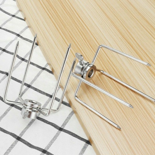 Otrzymasz 2 widelce zastępcze do zestawu rożna. 4 stożkowe, przesunięte zęby dla zwiększenia możliwości łatwego wkładania i wyjmowania, uchwyt ze śrubą radełkowaną dla łatwego i szybkiego dokręcania.