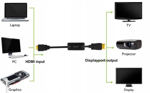 Umożliwia podłączenia komputera/laptopa oraz pozostałych urządzeń wyposażonych w złącze HDMI do monitora, projektora lub telewizora wyposażonego w złącze Displayport.
