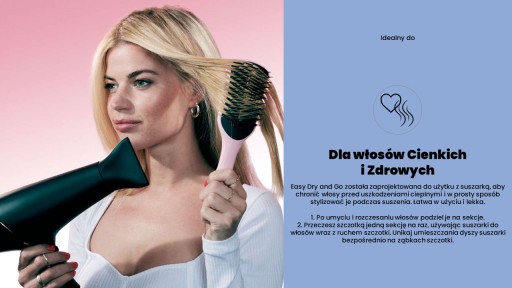 Easy, Dry & Go - do suszenia i stylizacji mokrych włosów. Szybko i bez problemu pomoże w ułożeniu - kręcone włosy wyprostuje, a prostym włosom doda blasku.
