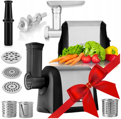 ✅ Bogaty zestaw akcesoriów – 3 dyski o różnej wielkości oczek, 4 nakładki do szatkowania warzyw, akcesoria masarskie, nakładka kebbe