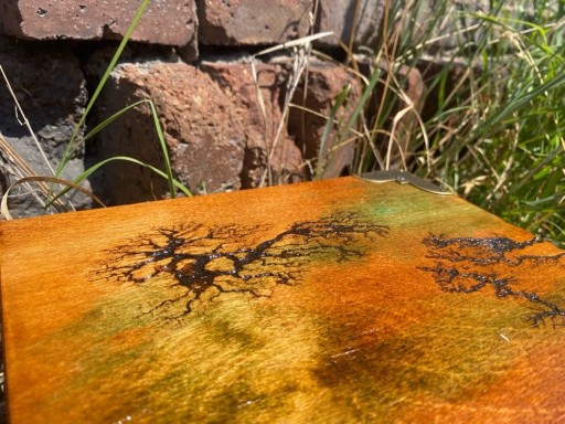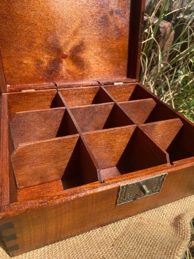 Drewniane pudełko ze dziewięcioma przegródkami na herbatę. Pudełko jest wypalane prądem, który tworzy wyjątkowe wzory, następnie barwione bejcą wodną i zabezpieczone lakierem. Herbaciarka posiada ozdobne zamknięcie oraz okucia.