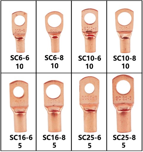 W zestawie dostępne są konektory oczkowe o dwóch różnych rozmiarach: M6 i M8. Oznaczenie M6 odnosi się do przewodów o średnicy 6 mm, podczas gdy M8 jest przeznaczone dla przewodów o średnicy 8 mm. Dzięki temu można dopasować konektor do odpowiedniego rozmiaru przewodu, zapewniając pewne i trwałe połączenie.