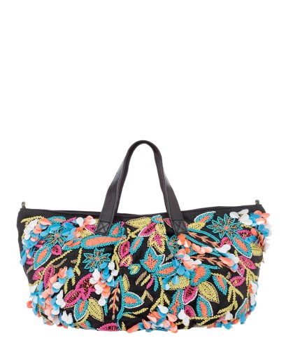 Torebka, kosz "miękka" w oryginalny haft koralikami z przodu, gdzieniegdzie cekiny. Piękny wzór, ornament w kolorach: amarant, turkus, koral, i szałwia z dodatkiem białego i bordo. Rączki ze skóry naturalnej cielęcej od zewnątrz, wewnątrz obszyte płótnem - do ręka i na przedramię. Dno torebki ze skóry naturalnej cielęcej. Dodatkowo dodany długi pasek również ze skóry naturalnej cielęcej oraz płótna (wewnętrzna strona). Torebka, kosz zapinany na zamek oraz zatrzask. Metalowe złote (stare złoto) wykończenia. Kosz z podszewkę w czarnym kolorze, wewnątrz są standardowo: dwie kieszonki otwarte i jedna zapinana na zamek. Wykończenie: rączki, pasek i dno torebki skóra naturalna cielęce w czarnym kolorze