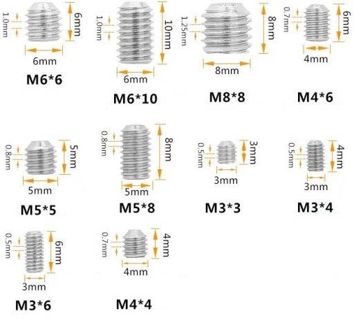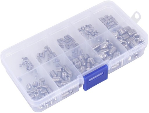 W skład zestawu wchodzą wkręty dociskowe o różnych rozmiarach i długościach zapakowane w pudełko: