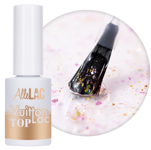 W skład serii VuittonLac Top wchodzą trzy topy o różnorodnym miksie kolorystycznym drobin. Drobinki są nieregularne, mienią się holograficznym blaskiem i skupiają na sobie wzrok dzięki odbijaniu światła wielobarwną tęczą. Dzięki spektakularnemu efektowi będą idealne do stylizacji typu nude, ale świetnie sprawdzą się również do princess nails zaaplikowane przy skórkach i pokryte warstwą półtransparentnego żelu lub bazy.