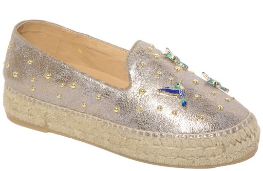Kanna – efektowne espadryle typu slip on w kolorze złotym ozdobione turkusowo-niebieskimi ptaszkami. Kod: 21KV21331