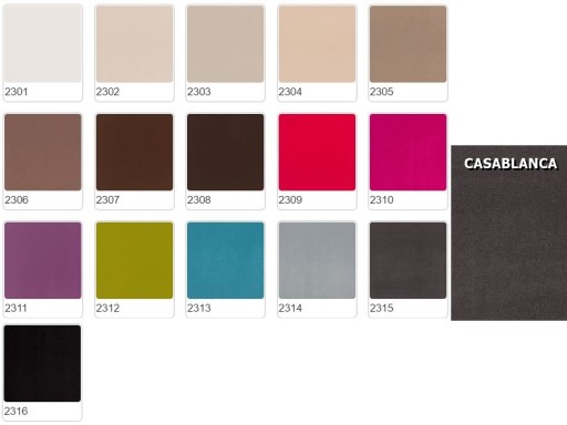 Wzornik z kolorami tkanin jest materiałem poglądowym i nie stanowi podstawy do reklamacji. Ze względu na ograniczenia wynikające z technologii oraz indywidualnych ustawień monitora, kolory mebli oraz tkanin ukazane na ekranie monitora mogą różnić się od rzeczywistych kolorów oferowanych mebli.