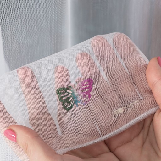 Fantazyjna biała firana w kolorowe holograficzne motylki uszyta z tkaniny firanowej typu markizeta.Tkanina matowa, miękka, plastyczna, dobrze się układająca, strukturą zbliżona do tkanin naturalnych