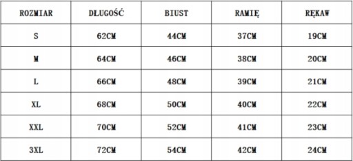 ROZMIAR:S DŁUGOŚĆ:62CM,BIUST:44CM,RAMIĘ:37CM,RĘKAW:19CM