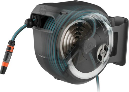 Przymocowany do dowolnej ściany bęben zapewnia bezpieczne i oszczędzające miejsce przechowywanie węża. Aby zacząć podlewać, wystarczy wyciągnąć odpowiednią ilość 30-metrowego węża. Jak tylko przestaniemy ciągnąć za wąż, blokada ustawiona na bardzo krótkie odstępy zatrzyma jego wciąganie, zablokowując go.