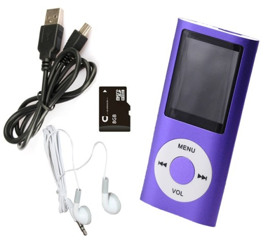 ODTWARZACZ MP4, KARTA PAMIĘCI Micro SD 8GB, SŁUCHAWKI, KABEL USB, INSTRUKCJA OBSŁUGI W JĘZYKU POLSKIM, PUDEŁKO