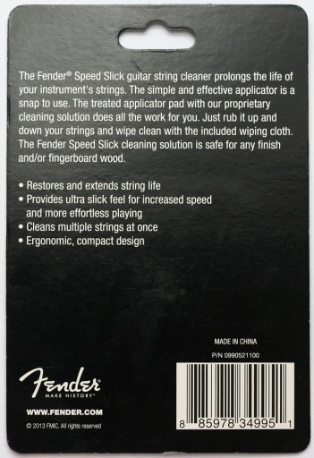 Fender Speed Slick Guitar String Cleaner wydłuża żywotność strun Twojego instrumentu. Aplikator jest bardzo prosty i skuteczny w użyciu. Wystarczy pocierać struny w górę i w dół oraz wytrzeć do sucha dołączoną szmatką. Roztwór czyszczący jest bezpieczny dla każdego wykończenia i drewna podstrunnicy