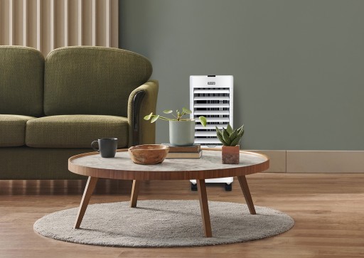 Specjalnie zaprojektowana mata ewaporacyjna zwilżana jest zimną wodą ze zbiornika. Proces parowania w połączeniu z dobraną mocą wentylatora wpływa na znaczne poprawienie komfortu cieplnego.