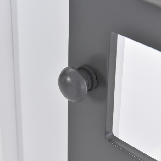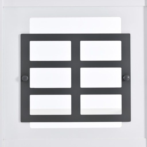 Front łóżka wyposażony jest z obu stron w okienka MDF, które zapobiegają upadkom dzieci, a jednocześnie są estetyczne. Piękno okien dodają szare kratowe ramy okienne z drobnymi gałkami.