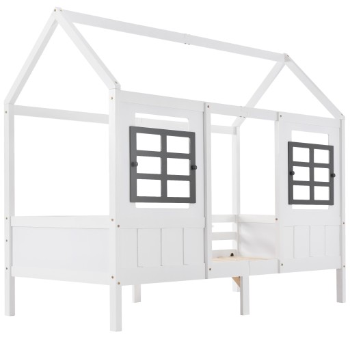 Łóżko domek, łóżko pojedyncze, łóżko dzienne, łóżko dziecięce z 2 oknami, rama sosna, MDF, biały (200x90cm)