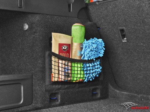 To wytrzymała siatka obszyta od dołu i po bokach taśmą typu rzep. Od góry wykończona gumą, która zabezpiecza i chroni akcesoria przed przemieszczaniem. Kieszeń mocuje się do wykładziny w bagażniku lub kabinie auta.