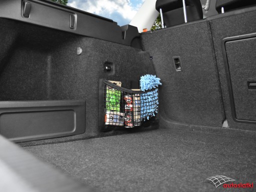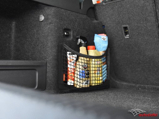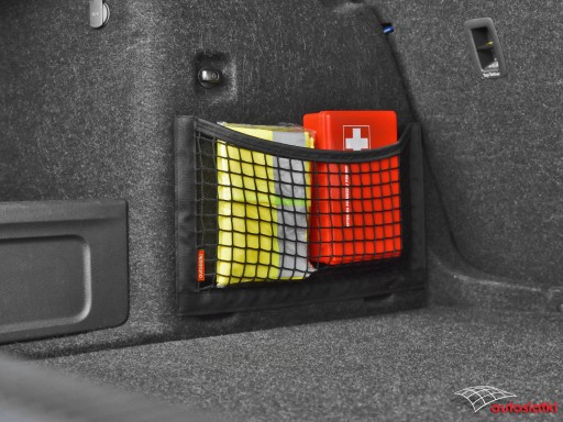 To wytrzymała siatka obszyta od dołu i po bokach taśmą typu rzep. Od góry wykończona gumą, która zabezpiecza i chroni akcesoria przed przemieszczaniem. Kieszeń mocuje się do wykładziny w bagażniku lub kabinie auta.