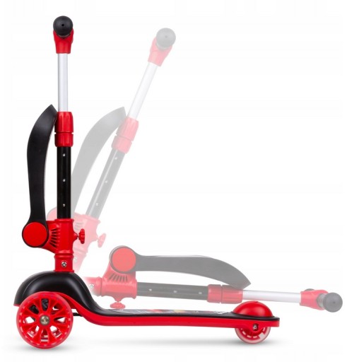Wygodny mechanizm zmiany funkcji pozwala na szybką metamorfozę jeździka w hulajnogę i to bez użycia narzędzi. Wystarczy odkręcić nakrętkę blokującą, następnie unieść siedzisko w górę i obrócić o 180 stopni wokół drążka kierownicy.