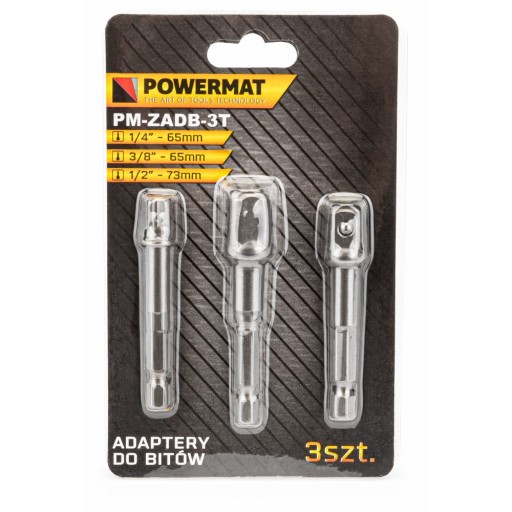 Zestaw adapterów HEX marki POWERMAT do nasadek 1/4", 3/8", 1/2". Adaptery wykonane ze stali, dodatkowo powierzchnia została oksydowana co gwarantuje wytrzymałość oraz długą żywotność.