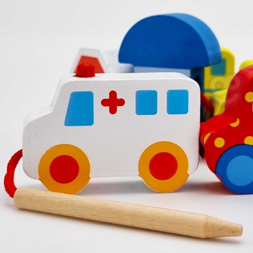 - zestaw składa się ze sznureczka oraz 12 klocków przedstawiających różne pojazdy, m.in.: straż pożarną, karetkę, traktor, samochody osobowe oraz znaki drogowe