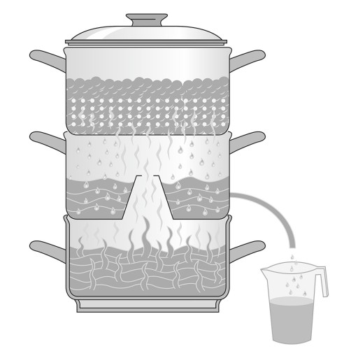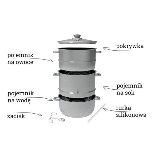 Zestaw składa się z trzech nakładanych na siebie naczyń:1 (górne) - na owoce;2 (środkowe - wyposażone w kranik spustowy) - na sok;3 (dolne)- na wodę;Sokownik jest również wyposażony w rurkę z tworzywa i metalowy zacisk.