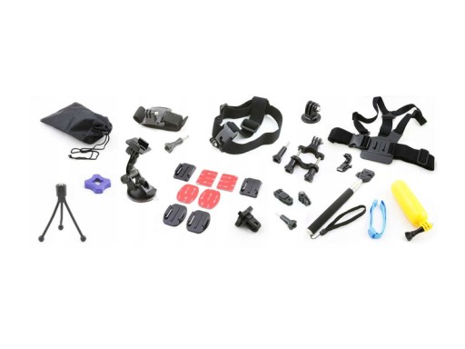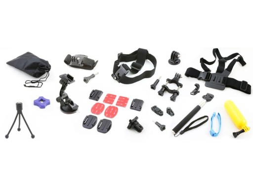 Chest Mount - uchwyt na klatkę piersiową, Head Mount - Uchwyt na kask/głowę, monopod - wysięgnik/ramię teleskopowe, bojka - uchwyt wypornościowy do kamer, uchwyt rowerowy wraz ze śrubą mocującą, zestaw oryginalnych przylepców i mocowań 3M, futerał na kamerę i akcesoria, profilowana szybko-złączka J-hook, adapter statywowy na gwint 1/4", zestaw elementów przedłużających ze śrubami, uchwyt na przyssawce, uchwyt nadgarstkowy, mini statyw elastyczny, klucz montażowy, dokumentacja.