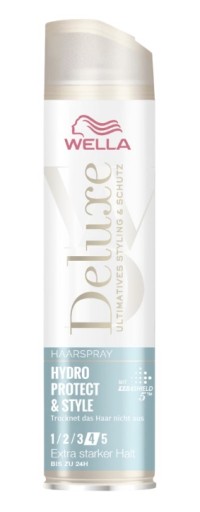 Wyjątkowo mocny lakier do włosów Hydro Protect & Style firmy WELLA Deluxe z innowacyjnym kompleksem ochrony keratyny zawiera pięciokrotną ochronę, która pomaga chronić strukturę włosów przed wilgocią, utratą połysku.
